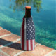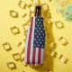 Um refrigerador de garrafas com foto de uma bandeira americana.