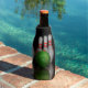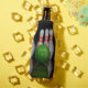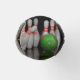 Um refrigerador de garrafas de boliche com fotos de pinos de boliche sendo derrubado por uma bola de boliche verde.
