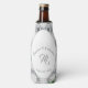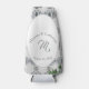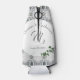 White Lace and Rosa Leaves design apresenta nomes de casais em texto elegante prateado exibido como um arco contra um suporte branco. O plano de fundo apresenta a imagem de um local branco. O centro exibe o sobrenome inicial. A data de casamento é exibida abaixo. As folhas verdes de rosa são delicadamente posicionadas nas bordas.