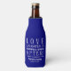 Um pequeno presente para lembrança de casamento - envoltórios de garrafa personalizados. Mostramos em azul-marinho com letras brancas, mas você pode mudar para qualquer cor. A frase "Amor, Riso e Felizes para Sempre" é completamente personalizável ou apenas personalize com seus nomes e data de casamento. Você pode adicionar texto no verso. Use a ferramenta "Personalizar" do Zazzle para inserir suas informações. Se precisar alterar a posição das caixas de texto, cor ou tamanho da fonte, basta clicar no botão "Clique para personalizar ainda mais" para alterar essas coisas e/ou adicionar texto na parte de trás e inferior e alterar a cor do fundo. Ideia de presente divertido para chá de casamento, jantar de ensaio ou recepção de casamento. MAIS CORES em nossa loja.