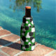 Este refrigerador de garrafas tem um design de Bauhaus de triângulos, círculos, retângulos e pentágonos em preto e branco num campo de verde.