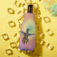 Uma fotografia de um belo beija-flor em voo contra um fundo gradiente colorido.