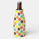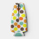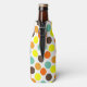Este refrigerador de garrafas tem um design geométrico de pontos azuis, laranja, amarelo e castanho.