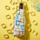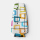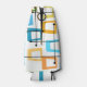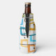 Este refrigerador de garrafas tem um design de retângulos que são esticados em uma extremidade em cores ranhuras, laranja, verde, teal, roxo, azul, rosa e amarelo com linhas atômicas que os cruzam.