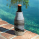 A foggy overcast day in Morro Bay California with the ocean waves hitting the rocks on the shore in this beach photograph souvenir. This seaside travel photo keepsake bottle cooler features black cursive script above the beach rocks and grey sky.