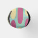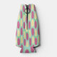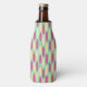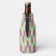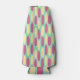 Este resfriador de garrafas tem um design geométrico de fundo de retângulos verde-marinho e azul-claro com ovais amarelos e cor-de-rosa no topo.