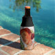 Cabeça vermelha retrorada segurando uma garrafa de refrigerante com um slogan engraçado.