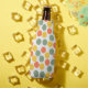Este refrigerador de garrafas tem um design geométrico de pontos em coral, ouro e verde-sábio.