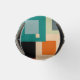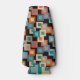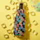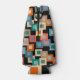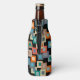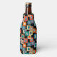 Este refrigerador de garrafas tem um design geométrico de quadrados dentro em tons mais leves de azul, lacre, laranja, bronzeado, esbranquiçado, manga e cinza em um campo de preto.