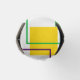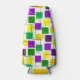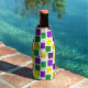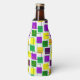 Este refrigerador de garrafas tem um design geométrico de quadrados em roxo, amarelo e verde espalhados com seus contornos.