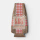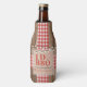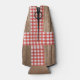 Este design de estilo rústico apresenta um fundo de madeira com fita vermelha e branca. Além disso, há uma textura de burlap, com serif vermelha e preta e fontes de script manuscritas, tudo personalizável para o seu evento, seja uma festa de noivado ou chás de casais. Celebre em estilo com este design de refrigerador de garrafa!