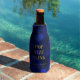 Elegante cooler apresentando as palavras "Pop Fizz Clink" em folha de ouro falso contra um fundo de luzes bokeh azul safira. Perfeito para festas de noivado, casamentos, aniversários ou vários outros eventos.