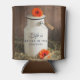 Uma lata mais fria que diz: A vida é melhor no país. Projetado com um tema rústico. Fotografia de uma jarra de leite branca e um casal de flores laranja colocadas em volta da lata de leite. Sentado num celeiro com feno. Painéis de madeira no fundo. Perfeito para a cabana.