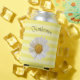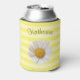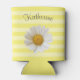 Uma foto de aproximação de uma margarida branca com nome personalizado em um fundo listrado amarelo.