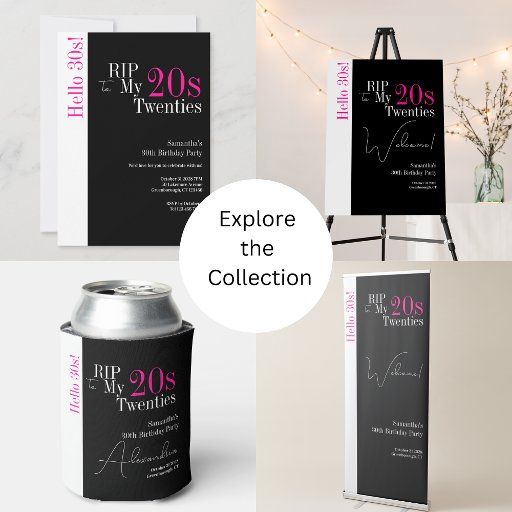 RIP 20s, Hello 30s, partido personalizado do aniversário de 30 anos, a favor design, perfeito para sua festa adulta de 20s do Dia das Bruxas, preta e rosa. - RIP simples 20s, design Hello 30s, está em preto clássico e branco com um pop de rosa quente. - design de tipografia Na moda. - É fácil editar modelos para você simplesmente adicionar seu nome e detalhes de festa de aniversário. Perfeito para uma legal e divertida festa do Dia das Bruxas, aniversário de 30 anos. * Para personalizar, basta usar o botão personalizar para adicionar seu nome e detalhes da festa, aqui você também pode alterar a idade ou o resto do texto se quiser. * Verifique a ferramenta de edição de design para alterar a cor ou a fonte. * Se você precisar de ajuda com a personalização, produtos correspondentes ou para um design personalizado, entre em contato comigo via chat zazzle.