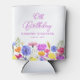 Uma bonito borda de flor silvestre de aquarela decora o fundo desta festa de aniversário personalizada pode resfriar. As flores silvestres coloridas são perfeitas para primavera ou festa de aniversário de verão. O nome e o aniversário do celebrante estão incluídos. Todo texto é editável.