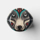 Este é um rosto de lobo decorativo feito à mão e estilizado com padrões astecas em cores preta, vermelha, turquesa e bege.