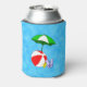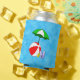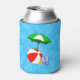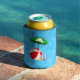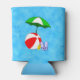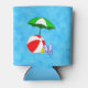 Divertido tema de praia ou piscina resfriador de latas com bolas de praia vermelhas, guarda-sóis verdes, sandálias de férias e óleo de bronzeamento em um fundo azul ondulado.