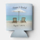 Cadeiras de praia podem resfriar com texto para um casamento. Inclua os nomes do casal e data do evento em ambos os lados. Duas cadeiras estão sob um guarda-sol olhando para o mar turquesa neste design tropical que é perfeito para um casal que ama o oceano. Texto em letra cursiva imprime em ambos os lados. Use em chás de panela, festas de noivado, jantares de ensaio e / ou recepções de casamento.