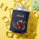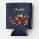 Copo can cooler navy escuro chic e elegante com belas flores burgundy e algumas folhas douradas elegantes .