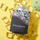 Cinzas escuras elegantes e amortecedores florais brancos monogramas com faixas dinâmicas metálicas em prata e roxo rosa quente.