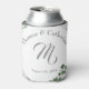 White Lace and Rosa Leaves design apresenta nomes de casais em texto elegante prateado exibido como um arco contra um suporte branco. O plano de fundo apresenta a imagem de um local branco. O centro exibe o sobrenome inicial. A data de casamento é exibida abaixo. As folhas verdes de rosa são delicadamente posicionadas nas bordas.