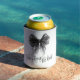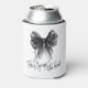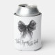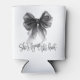 Simple minimalist black and white 'She's tying the knot' themed bridal shower can cooler showcasing an elegant coquette style black bow and modern calligraphy script.