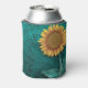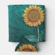Um girassol vibrante com uma face pétala amarela brilhante e um centro marrom circular. O girassol está posicionado no lado direito da imagem. Ao redor do girassol está um design detalhado e ornamentado, gravado em fundo de cor turquesa. Este design consiste em intrincados espirais e padrões que se assemelham a motivos florais. O caule e as folhas do girassol são também representados em uma tonalidade semelhante, que fornece um contraste harmonioso com as pétalas amarelas.