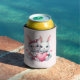 A can cooler with an illustration featuring 2 white furry bunnies sharing a big pink heart. The girl bunny is wearing a cute bow on her head and heart-shaped glasses. The boy bunny is wearing an adorable little suit with a tie.