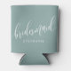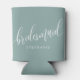Este elegante protetor de lata para damas de honra em azul turquesa poeirento apresenta texto com letra moderna, perfeito para celebrar seu dia especial com estilo. Personalizável com o nome de cada dama de honra, este design elegante é um presente atencioso e funcional para sua comitiva de noiva. Ideal para as festividades do casamento, festas de despedida de solteira e chás de noiva, este protetor de lata estiloso mantém as bebidas frias enquanto adiciona um toque pessoal.