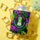 Uma diversão pode resfriar com um tema tiki, uma máscara tiki em verde sobre um fundo impressão havaiano tropical em azul, rosa e verde em preto impresso com seus nomes para um chá temático colorido da ilha.