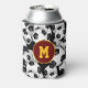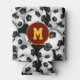 Este refrigerador de bebidas enlatadas personalizado com tema de futebol apresenta um padrão de bolas de futebol aparentemente intermináveis e organizadas aleatoriamente em um fundo preto - personalize o monograma num pingente de marrom e círculo dourado - personalize as cores do pingente e do monograma circulares para combinar com as cores de uma equipe de futebol favorita - por katz_d_zynes