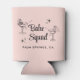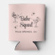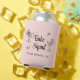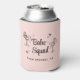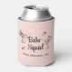 Cooledores de lata cor-de-rosa para presentes de meninas para a sua festa de solteira com ilustrações de meninas de festa tomando sol em copos de coquetel, estrelas de brilho retrô, "Babe Squad" em uma fonte retrô e o local da sua festa ou outro texto em tipografia simples.