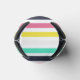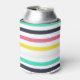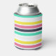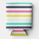 Uma lata colorida pode resfriar com um padrão listrado. O resfriador é principalmente branco com faixas horizontais em azul marinho, rosa, amarelo, turquesa e azul marinho. Ele foi projetado para ajustado de uma lata de bebida padrão.
