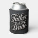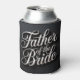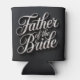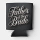 This insulated can cooler features a text design of Father Of The Bride in metallic silver script lettering on a matte black background. The text has a metallic sheen and casts a shadow, creating a dimensional effect. The letters are stylized with decorative flourishes and swirls especially in the word Father. The text is arranged in two lines, with Father on top and of the Bride below. The lettering has a modern calligraphic style with artistic flourishes. The can cooler is made of polyurethane foam. The collapsible foam material makes for easy storage. You can get great volume discounts for weddings, tailgates and special events. The can coolers are made for twelve ounce cans.