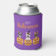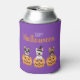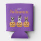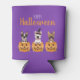 Ilustração de três cachorros franceses do Bulldog de diferentes cores em abóboras vestidas em trajes de Dia das Bruxas.
