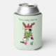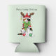 Gato calico giro vestido com luzes de natal, chifres recheados, chapéu de Natal, e um grande arco verde contra um pano de fundo verde-claro, O gatinho não está feliz!