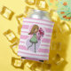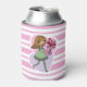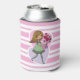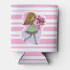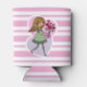 Cute pink and white stripped can cooler featuring a whimsical girl with long flowing yellow hair and wearing a green dress and stripped stockings. She is holding a beautiful bunch of red roses in her outstretched arms. The background is made up of a pink and purple love heart.