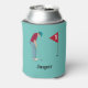 Jogador de golfe personalizado, azul pálido/teal, vestindo um boné, camisa vermelha profunda e calças azuis, colocando uma bola de golfe em uma lata mais fria.