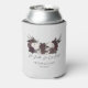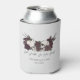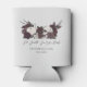 This Gothic Wedding Skulls & Roses Can Cooler features a dramatic hand-drawn illustration of two skulls adorned with dark floral roses, creating a bold gothic focal point. Beneath the artwork are editable text areas for a custom heading, bride and groom names, and wedding date for a personalized touch. The text is a very dark burgundy, almost black.