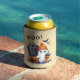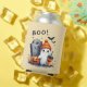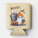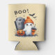 Esta diversão pode mais legal tem um fantasma bonito vestindo um chapéu de tricô laranja. Ele está ao lado de uma lápide que diz RIP, e um jack o'lantern. Os morcegos estão voando entre as estrelas. Ele também está carregando uma bebida laranja com um morcego nela. O fundo é um padrão de bolinhas branco e cor de laranja claro. Diz BOO! No topo, estes refrigeradores são perfeitos para o vosso Halloween se juntarem!