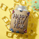 This Happy New Year can sleeve features a holiday greeting image with metallic silver text HAPPY NEW YEAR centered on a textured golden background. The text has a chrome finish with reflections and shadows. Around the text are eight large square gemstones in various colors - red rubies, blue sapphires and purple amethysts. Each gemstone is positioned at an angle, creating a decorative frame around the central text. The can cooler is made of polyurethane foam. The can sleeves are made for twelve ounce cans.
