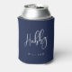 O nome personalizado e o monograma do script hubby de na moda e tendências podem ser mais frios. O design apresenta "Hubby" na caligrafia de script branco na moda num fundo azul marinho e nome personalizado. O fundo do refrigerador de latas é personalizado com bigode e design de monograma.