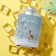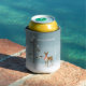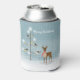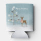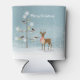 Ilustração de Natal. Veado com cachecol vermelho e pássaros na floresta nevada. Personalizável pode resfriar modelo