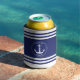 Estes refrigeradores mantêm suas bebidas bonitas e frias no seu dia na praia ou churrasco familiar. Este design apresenta uma âncora branca com uma borda circular de corda e três listras horizontais brancas na parte superior e inferior sobre um fundo azul marinho. Personalize com um nome em tipografia branca. O fundo azul do marinho pode ser alterado para outra cor personalizando e selecionando outra cor de fundo.