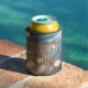 This Can Sleeve features metallic gold letters spelling PARTY ON against a dynamic background. The text has a chrome-like finish with reflective edges and shadows, creating a dimensional effect. The letters are arranged in two lines, with PARTY on top and ON below. The background features a dramatic light beam effect from the top, creating a bright spotlight effect. The scene is decorated with floating golden confetti pieces and glowing circular bokeh effects in warm tones. The can sleeve is made of polyurethane foam. The can cooler is made for twelve ounce cans.