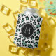 Esta tendência, divertida, preta e verde-menta manchas de leopardo-brancas padrão de impressão animal é um fundo perfeito para uma etiqueta circular branca e preta com sua inicial em texto branco em uma letra elegante. GraphicsByMimi © Personalize esta design de impressão em negrito, na moda, giro-leopardo com seu monograma, texto, inicial ou nome. Use o campo modelo ou a opção "personalizá-lo" para um menu de edição de cheio. A. Outras cores disponíveis.