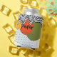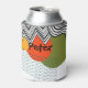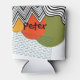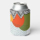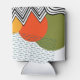 Este resfriador tem um design moderno do século médio de curvas e linhas ziguezagueadas em preto, círculos em amarelo, laranja e verde, e um retângulo feito de linhas tracejadas.