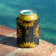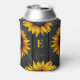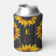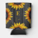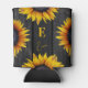 Elegante e estiloso buquê de girassóis amarelos brilhantes, isolador de latas com um nome em caligrafia cursiva e monograma inicial sobre um fundo rústico de madeira de celeiro marrom escuro moderno. ++++++++ Poderia ser um lindo presente para um chá de noiva, aniversário, Sweet 16, despedida de solteira, equipe de noiva, damas de honra ou madrinha.