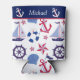Um padrão náutico colorido é a característica nesta lata personalizada mais fria. As imagens incluem uma âncora, uma roda de navio, uma boia salva-vidas, um veleiro e um galpão. As imagens estão em vermelho e azul e colocadas sobre um fundo branco. No topo está uma seção de marinho sólido bordada em vermelho. A seção superior tem seu nome em branco entre duas âncoras brancas.
